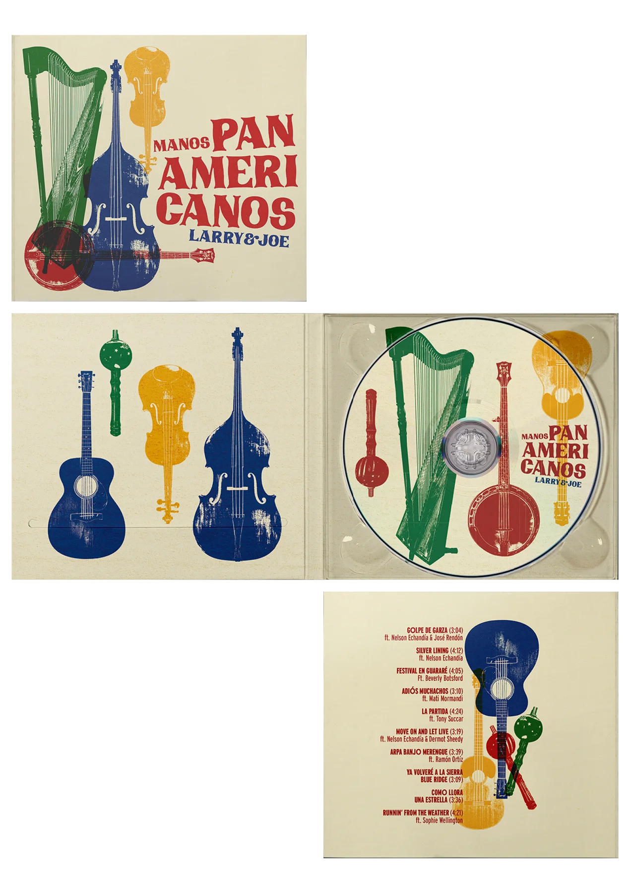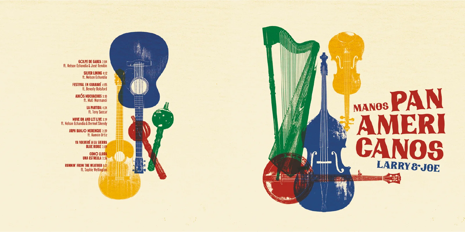 COVER DESIGN AND PACKAGING FOR MULTI-INSTRUMENTALIST, GRAMMY NOMINATED MUSICAL DUO FROM NORTH CAROLINA AND VENEZUELA. MANOS PANAMERICANOS FEATURES ARTISTS AND FRIENDS FROM ALL OVER NORTH AND SOUTH AMERICA IN THIS CROSS-GENRE EXPLORATION OF AMERICAN MUSIC FROM TANGO TO WALTZ TO MERENGUE TO POP. CUSTOM TYPOGRAPHY AND ILLUSTRATIONS BASED ON THE ARRAY OF INSTRUMENTS.