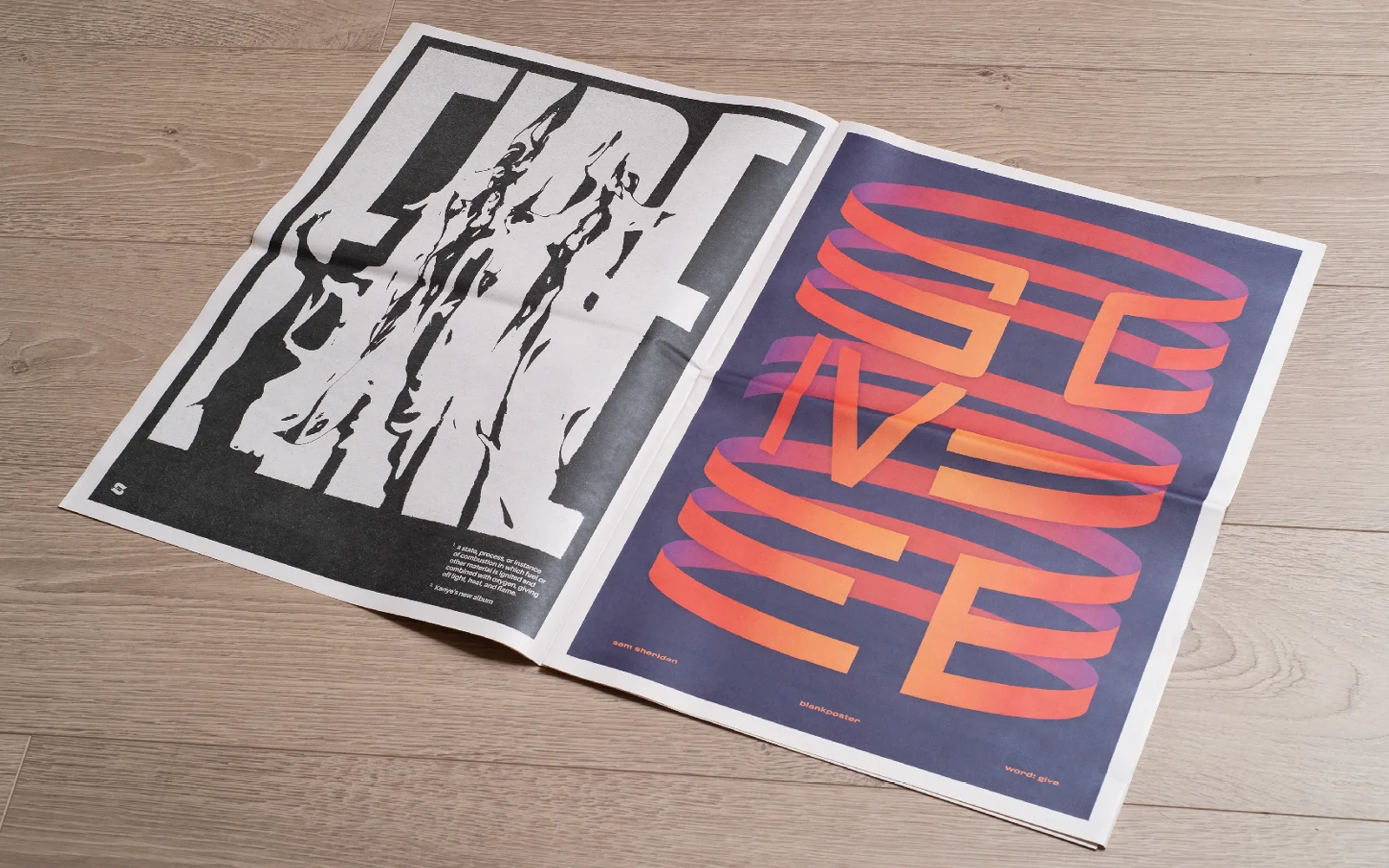 BROADSHEET NEWSPAPER MADE FROM POSTERS CREATED OVER THE YEARS. FEATURING SOME OF MY FAVOURITE COMPOSITIONS AND TYPOGRAPHIC EXPLORATIONS. THE BROADSHEET FORMAT WAS CHOSEN TO SHOWCASE THE POSTERS AT SCALE. REQUIRING TWO HANDS TO HOLD, THIS ZINE DEMANDS YOUR FULL ATTENTION WHEN READING.